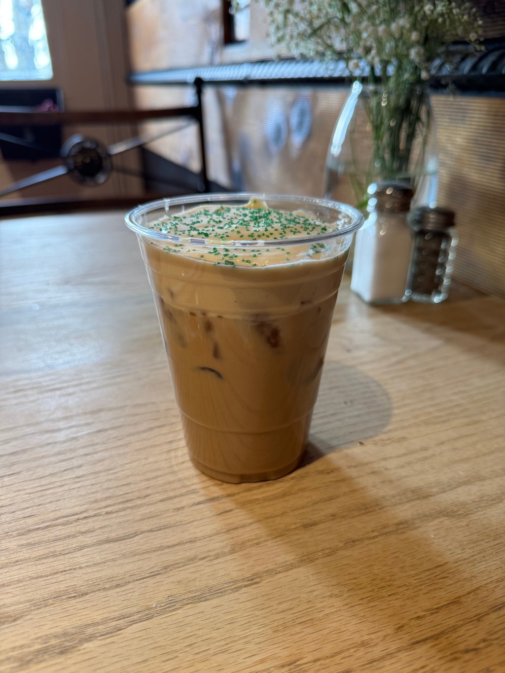 There is a coffee shop near where I live called The Iron Cafe, located in Montgomery, New York. This shop has been around since forever and everyone that lives in the area has been to this coffee shop. There is a casual, calm, and old timey vibe to the cafe and the baristas there are always the nicest people and willing to answer any questions! Today I went in and asked that baristas what specialty coffee they recommend and they chose the Oatmeal Cookie iced coffee. To make this coffee they start with brown sugar and hazelnut with sweet caramel sauce. After adding the espresso, ice is added and then cold milk is poured over the top. The latte is topped with caramel cold foam mixed with Himalayan pink salt and some green sprinkles on top to make it look top tier. I love coffee and I am really picky about how I like my coffee and I would rate this a 10/10. The cafe and the coffee were amazing, the customer service was phenomenal, and the prices weren’t too expensive too! I am a Dunkin loyalist, so I often compare coffee to the ones I get at Dunkin and I have to say this one beats anything I could ever get at Dunkin. Since it is a local cafe, it feels more like a family when you walk in and the employees genuinely care about the drinks and food being good for their customers. Unlike Dunkin, who is very fast paced and your drink may be good or may taste like dirty water. I would definitely recommend The Iron Cafe to anyone and everyone!!
